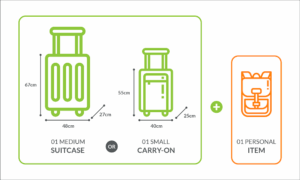 - 1 beg pakaian sederhana (67 × 48 × 27 cm) ATAU 1 beg tangan kecil (55 × 40 × 25 cm)